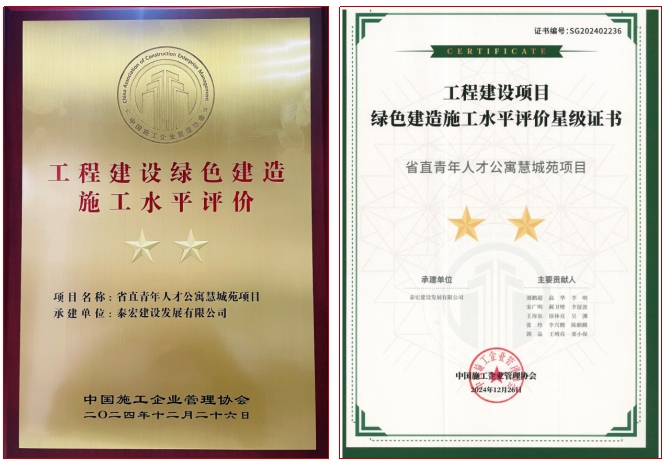 2025416日,由中国施工企业管理协会举办的2025年工程建设行业绿色低碳建造工作推进大会在郑州市隆重召开,会上颁发了2024年第二批工程建设项目绿色建造施工水平评价证书与奖牌,泰宏建设承建的省直青年人才公寓慧城苑项目,获得工程建设项目绿色建造水平二星级评价。
